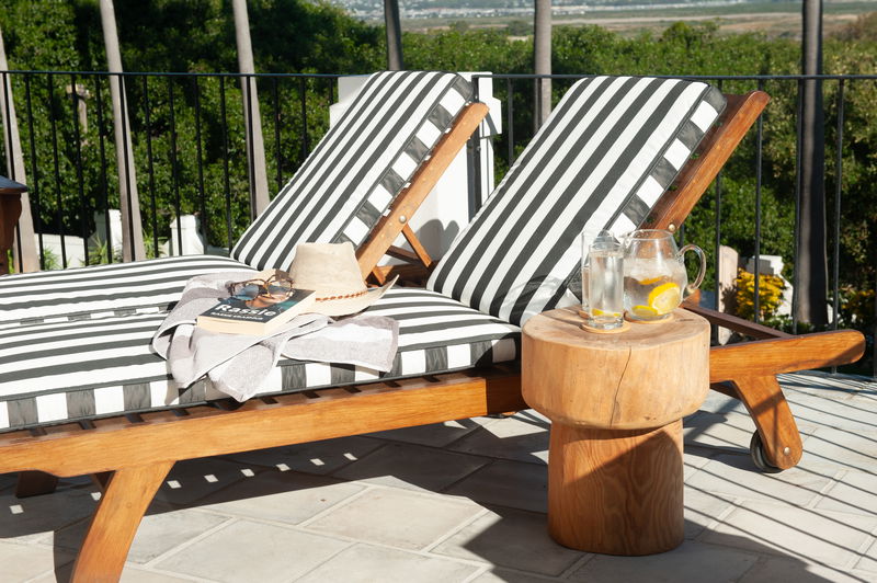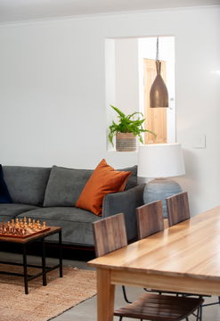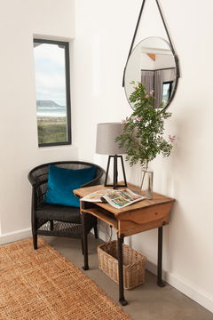 From the lounge and kitchen areas, sliding doors open out onto a fabulous covered patio with a further dining table and chairs, an outdoor couch and an armchair, giving guests shelter and shade outdoors, year-round. Adjacent, you’ll find an inviting 6 x 3-metre outdoor swimming pool flanked by smart poolside seating, sun loungers and a BBQ/braai area.