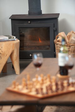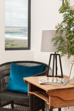 The open-plan living areas are found on the first floor, where a beautiful lounge/diner has a comfortable sofa area gathered around a TV and wood burner for cosy evenings in, and a dining area with a generously sized dining table and seating, perfect for lively breakfasts and laid-back suppers. The kitchen is an elegant, contemporary space with polished concrete counters and an island, an electric oven and gas hob, an espresso machine, an American-style fridge-freezer and a dishwasher. The utility room off has a washing machine for that unavoidable holiday laundry load and there’s a handy WC on this floor too.