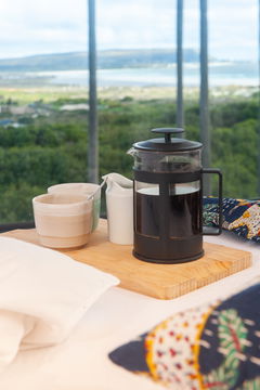 Up on the second floor you’ll find all four bedrooms – two king-size and two twins with zip-and-link single beds which can be presented as king-size – and a large family bathroom with a walk-in shower. Two of the bedrooms have ocean and mountain views, while the other two restfully overlook the leafy surrounding area. The king-size master bedroom is a particularly striking room, with exposed rafters, floor-to-ceiling windows and a sleek en-suite shower room.